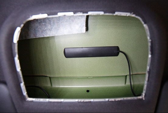 11. Если Ваша версия блока управления не оснащена встроенной антенной GSM, прикрепите выносную антенну также в нише очечника/плафона.