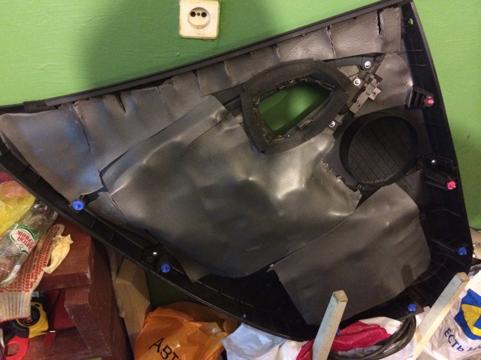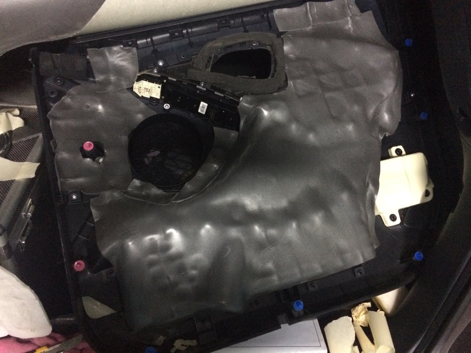 6. В качестве первого слоя используется вибропласт. Обезжирьте места на которые будете наносить вибропласт. Вырежьте подходящие куски вибропласта, нагрейте их техническим феном. Нанесите на дверь и прикатайте валиком вибропласт. Установите динамик на место.