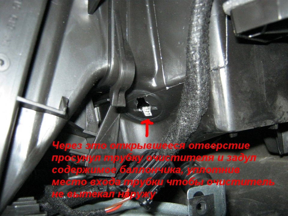Немного подумав, я решил посмотреть, что там ниже — открутил саморез и отогнул обшивку салона в ногах пассажира слева. И я увидел датчик, как я понял, это датчик температуры, отключающий кондиционер для исключения промерзания испарителя. Отключил разъем от него, поворотом против часовой стрелки на 90 градусов извлек сам датчик и увидел, посветив фонариком в отверстие, соты испарителя. Так я получил доступ в виде небольшого отверстия для подачи очистителя для очистки испарителя кондиционера. Очистку выполнил строго в соответствии с инструкцией.