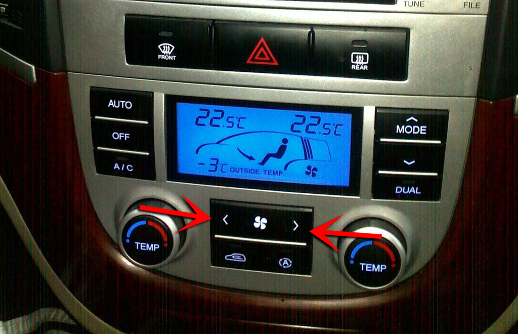 Установите ручку регулировки температуры воздуха в желаемое положение (для повышения температуры вращайте ручку по часовой стрелке, для снижения температуры - против часовой). Левая ручка отвечает за воздух в левой части салона. Правая ручка отвечает за воздух в правой части салона. Подробнее описано в этой статье.