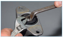 Удерживая разводным ключом верхний конец штока амортизатора, z-образным ключом «на 13» отворачиваем гайку крепления верхней опоры к штоку амортизатора.