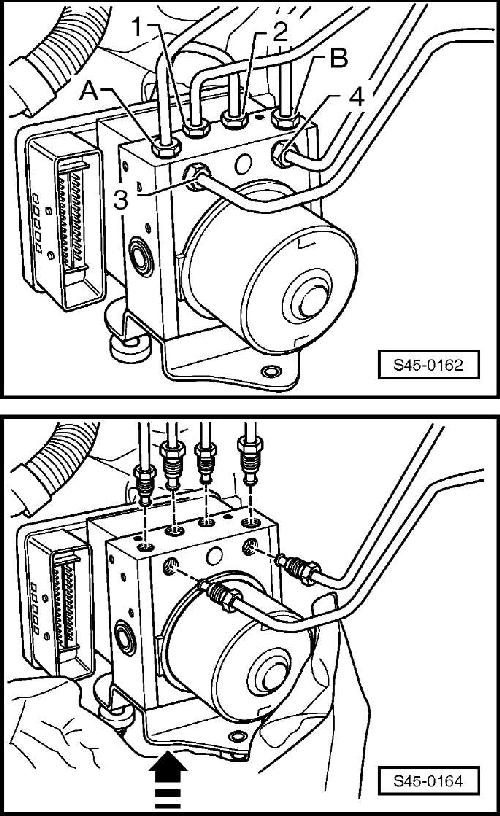 — Пометив оба трубопровода тормозного привода, ведущие от главного тормозного цилиндра -A- и -B-, отвинтить их от гидравлического устройства управления.