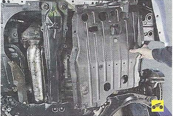 3. Снимите левый брызговик двигателя.Замена датчика положения коленвала Nissan Primera