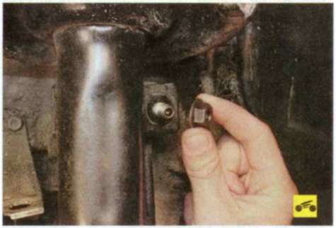 3. Удерживая палец шарнира от проворачивания, отверните гайку крепления шарнира к кронштейну стойки передней подвески...