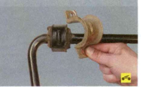 4. ...и снимите штангу стабилизатора в сборе со стойками, подушками и скобами крепления.