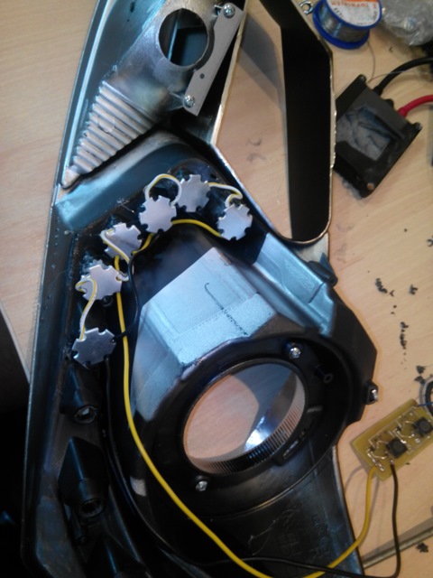 И самое главное. Я не стал городить схемы для снижения яркости в режиме габаритов. это сильно усложняет схему и уменьшает надежность. Поэтому я решил, что у меня они не будут светиться при включенном ближнем свете. И для этого я установил внутри фары небольшие реле. Которые при включении ближнего отключают диоды. Теперь я некого не слеплю. А то мощность свечения и так очень сильная.
