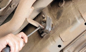 3. Поддев отверткой, снимите левую подушку подвески основного глушителя.