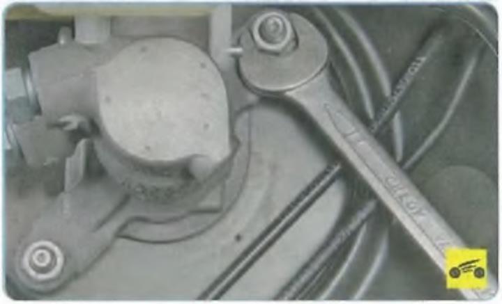 6. Отверните две гайки крепления главного тормозного цилиндра к вакуумному усилителю и снимите главный тормозной цилиндр в сборе с бачком.