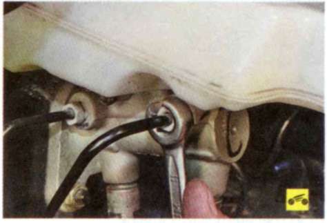 6. Отверните гайки крепления двух трубопроводов к главному тормозному цилиндру и отведите трубопроводы в сторону.