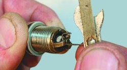 6. Проверьте круглым щупом зазоры между электродами свечи. Они должны составлять 0,6–1,6 мм.