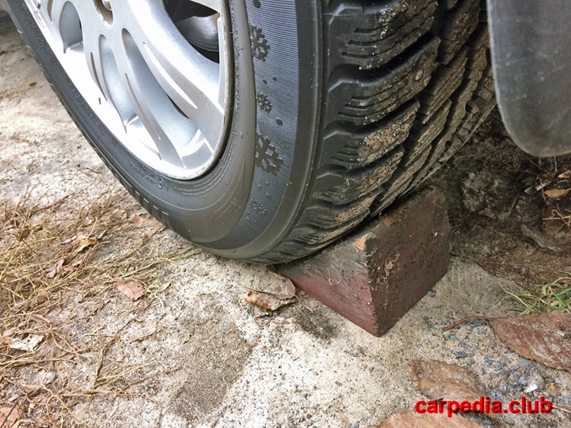 2. Затормозите автомобиль стояночным тормозом и установите противооткатные упоры («башмаки») под задние колеса.