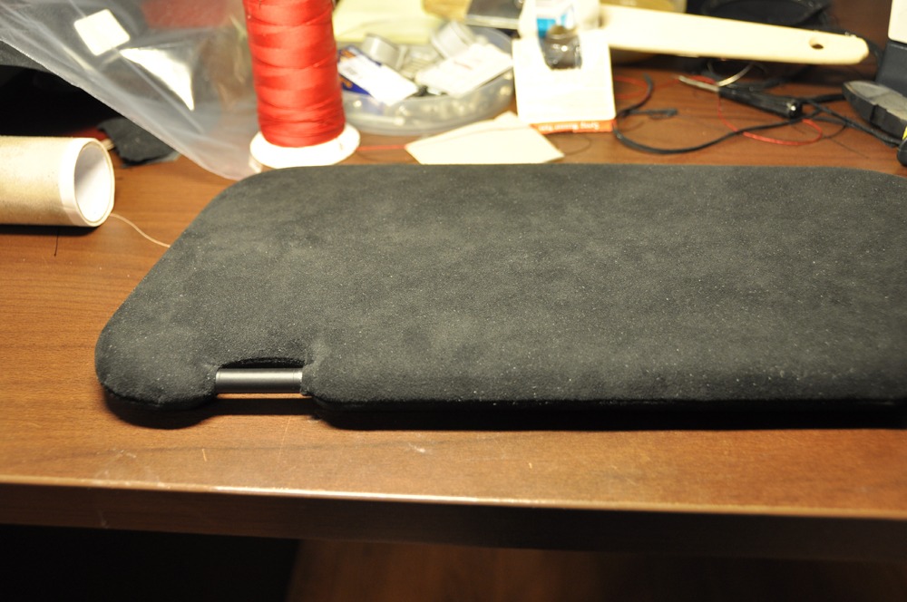15. Вырезаем часть материала под зеркало, устанавливаем на место кронштейн козырька и, припаяв провода к зеркалу, защёлкиваем его на место.