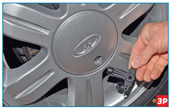 6. Специальным ключом из штатного инструмента отворачиваем болт крепления колпака колеса.