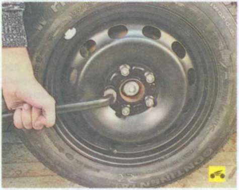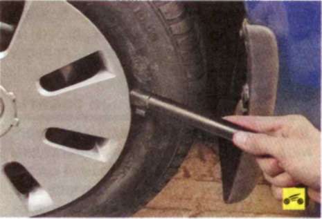 8. С помощью домкрата слегка приподнимите автомобиль, но так, чтобы колесо, требующее замены, не отрывалось от дороги. Баллонным ключом ослабьте пять гаек крепления колеса.