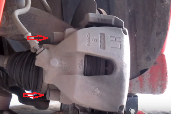 8. Отведите суппорт в сторону и зафиксируйте так, чтобы не было нагрузки на тормозной шланг.