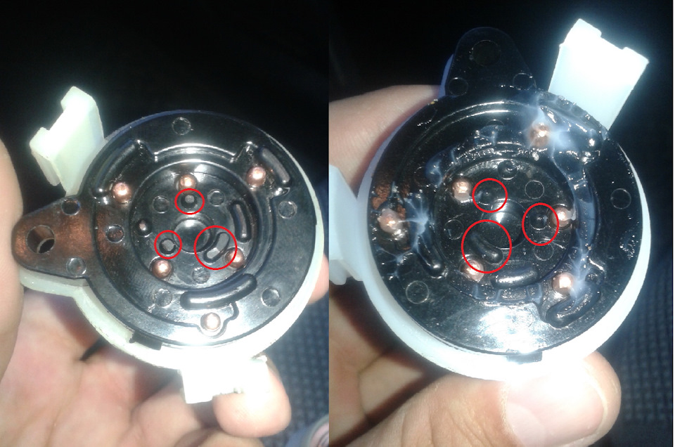 Если располовинить контактную группу, то можно увидеть саму проблему. Она заключается в изношенных частях контактной группы. Для наглядности, фото старой и новой контактной группы (изношенные части показаны красными кругами).