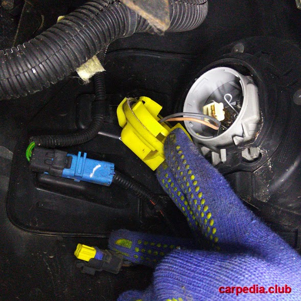 2. К желтому кожуху передней противотуманной фары Ситроен Берлинго 2 присоединен сверху фиксатор.