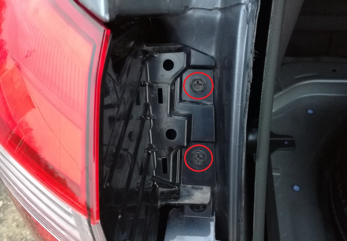 5. Крестовой отверткой или торцевой головкой на 10 мм отверните 2 болта крепления заднего фонаря с лампочками к кузову Хендай.