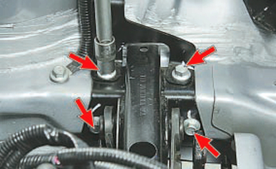 8. Выверните четыре болта крепления левой опоры подвески силового агрегата, вывешивая двигатель таким образом, чтобы нижние болты при выворачивании не упирались в кронштейн коробки передач.
