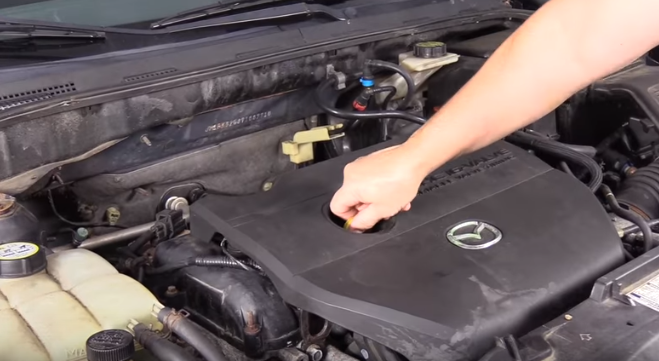 20. Запустите мотор на несколько минут и остановите. Замерьте повторно уровень масла на Мазда 3. Если он не доходит до нижней метки на указателе, необходимо долить жидкость.