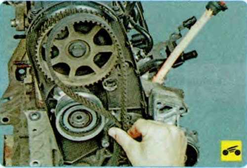 Для установки поршня 1-го цилиндра в положение ВМТ такта сжатия требуется снятие верхней крышки ремня привода газораспределительного механизма (для получения доступа к установочным меткам на шкиве распределительного вала и на головке блока), что влечет за собой трудоемкие предварительные операции по снятию правой опоры подвески силового агрегата. С точностью, достаточной для установки поршней 1-го и 4-го цилиндров в положение ВМТ при замене маслосъемных колпачков, распределительный вал можно установить в требуемое положение, контролируя его визуально. Проворачивая коленчатый вал, нужно установить распределительный вал так, чтобы пятки коромысел привода обоих клапанов 1-го или 4-го цилиндров опирались на затылочные части кулачков распределительного вала, а коромысла можно было переместить «покачиванием» в пределах зазора.