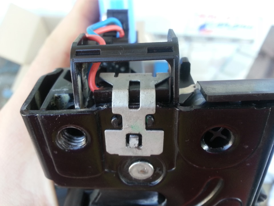 Далее приступаем к снятию микро замка. Он удерживается за счет металлической пластинки и двух штифтов.