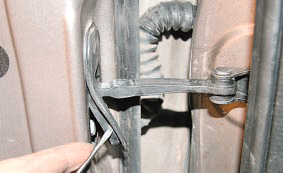 9. Установите новый ограничитель открывания передней двери и все детали в порядке, обратном снятию.
