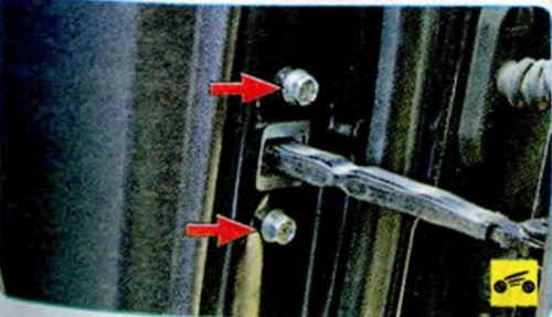4. Выверните два болта крепления ограничителя к торцу передней двери.