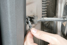 7. Выверните два болта крепления ограничителя открывания к панели задней двери…