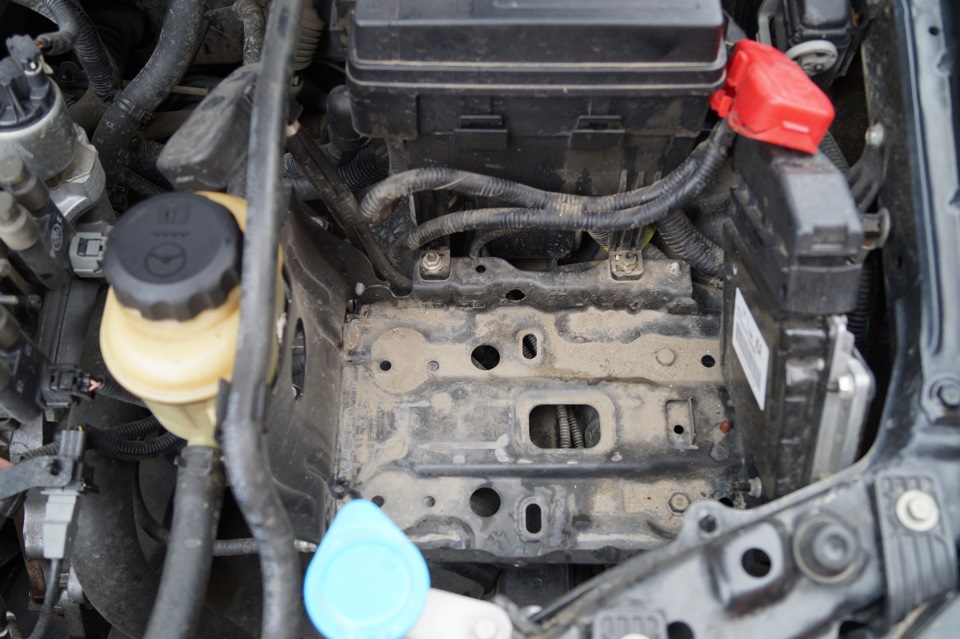 9)Откручиваем гайку крепления ЭБУ и два болта крепления площадки АКБ к кузову. Снимать эту площадку не нужно, её необходимо только подвинуть, для того, чтобы вытащить опору.