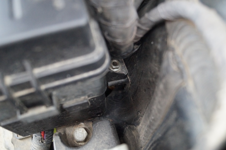 8) Следующим этапом снятия опоры будет снятие площадки АКБ. Откручиваем гайку крепления привода сцепления.