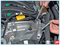 Снятие крепления кронштейна опоры к верхней крышке привода ГРМ Lada Largus