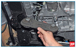 3. Подставляем под картер коробки передач через деревянный брусок регулируемый упор (например, домкрат). Головкой на 16 отворачиваем три болта крепления кронштейна опоры к коробке передач.
