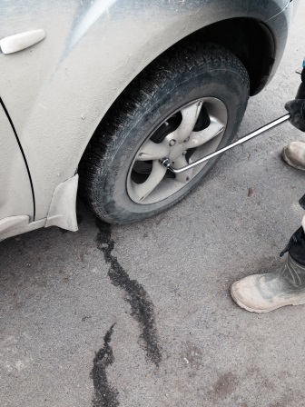 1. Активируйте стояночный тормоз и установите под левое заднее колесо противооткатный упор. Отверните балонным ключом гайки правого переднего колеса на 1 оборот, а потом с помощью домкрата вывесьте правую переднюю часть автомобиля и полностью отверните гайки для снятия колеса.