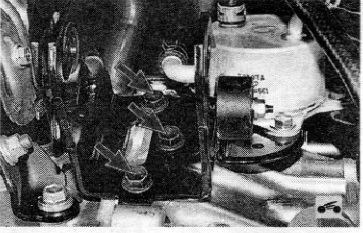 8. Отверните гайку болта крепления подушки передней опоры к кронштейну, извлеките болт и снимите подушку.