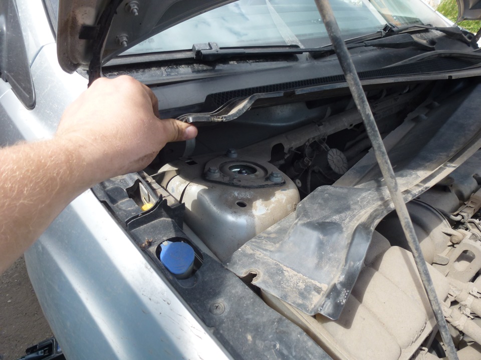 И снял нижний пластик, чтобы добраться до болтов крепления стойки не снимая дворников.