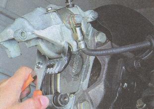 10. Опускаем корпус скобы и заворачиваем болт крепления нижнего направляющего пальца. Аналогично заменяем тормозные колодки другого колеса.