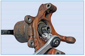…и снимаем поворотный кулак в сборе со ступицей со шлицевого хвостовика корпуса наружного шарнира привода колеса.