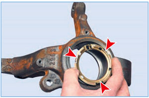 После запрессовки подшипника устанавливаем в канавку кулака стопорное кольцо. Затем запрессовываем ступицу в подшипник.
