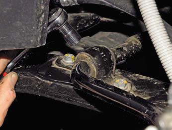 Головкой «на 13» отворачиваем два болта крепления скобы штанги стабилизатора к подрамнику.