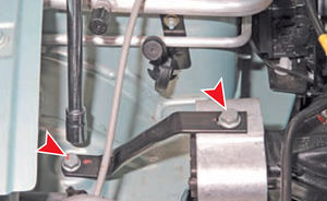 8. Головкой «на 16» отворачиваем два болта 1 крепления кронштейна подушки опоры к кузову и три болта 2 крепления кронштейна опоры к верхней крышке ремня привода ГРМ.