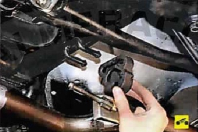 4. Придерживая приемную трубу и основной глушитель, снимите подушку их подвески (ее удобно поддеть отверткой) и приемную трубу с дополнительным глушителем с автомобиля.