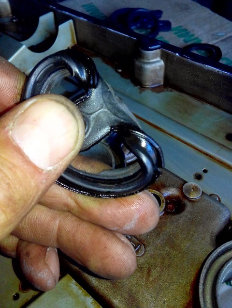 Старая прокладка свечных колодцев, уже мало похожа на резинове изделие, трещины при изгибе.