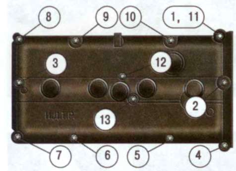 14. Установите крышку головки блока цилиндров с новой прокладкой и все снятые детали в порядке, обратном снятию. Болты и болты-шпильки крепления крышки затягивайте в порядке, показанном на рисунку, в два этапа: