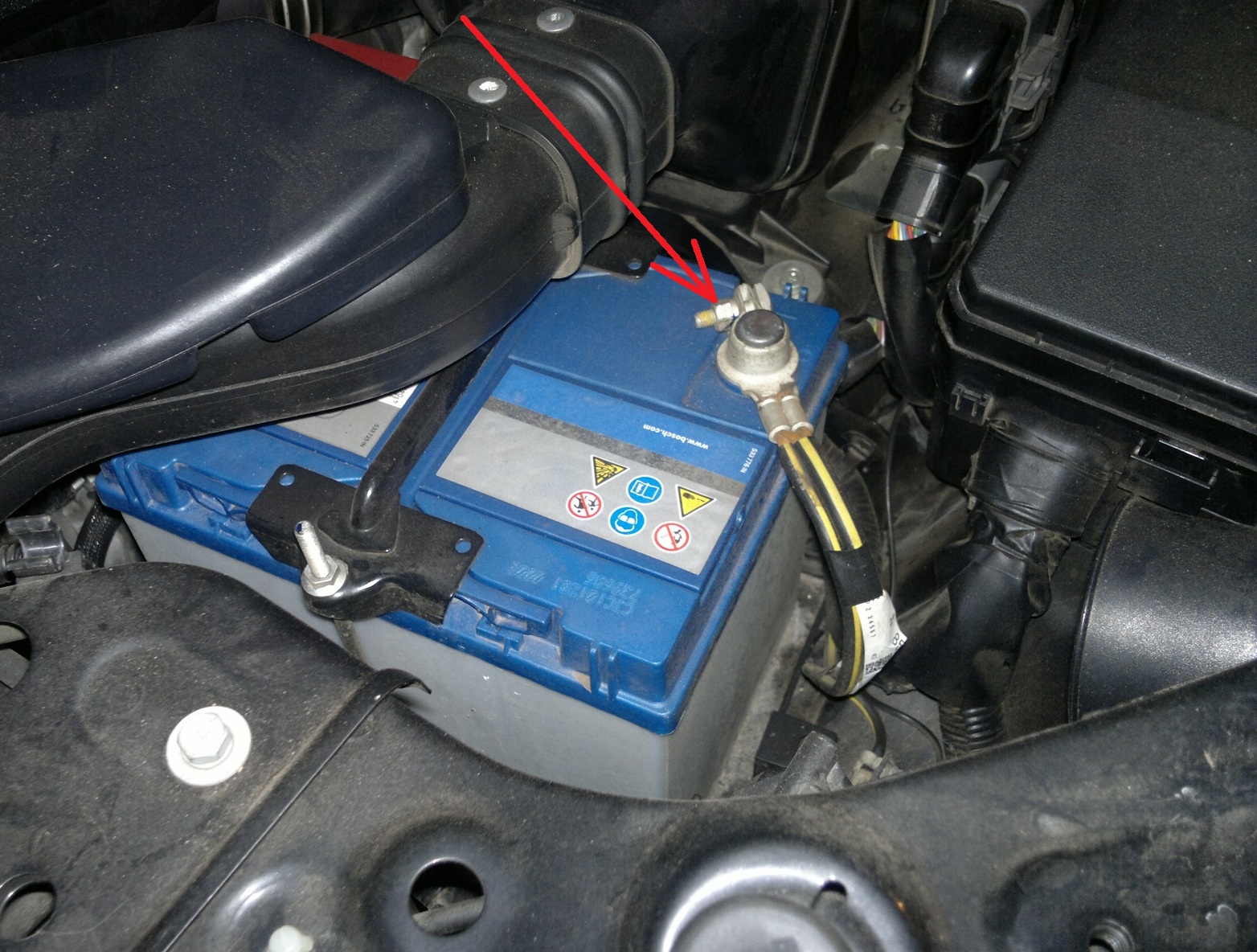4. Отсоедините провод от клеммы "минус" аккумуляторной батареи.