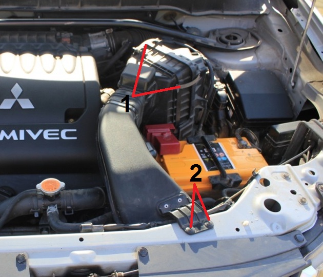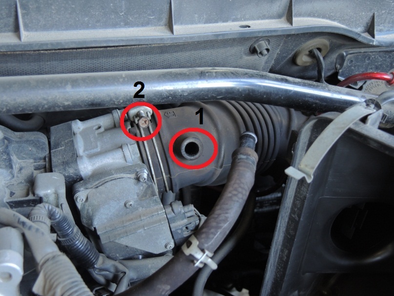 4. Отсоедините от корпуса воздушного фильтра фиксаторы жгута проводов (см. первое фото ниже), воспользовавшись изогнутыми круглогубцами. Сжав хомут, сдвиньте его и снимите шланг системы вентиляции картерных газов с патрубка 1 воздухоподводящего шланга. Затем отверните винт хомута 2 воздухоподводящего рукава, винт крепления корпуса воздушного фильтра (см.третье фото ниже) и снимите воздухоподводящий рукав с задней частью воздушного фильтра.