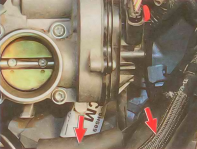 2. Сдвиньте вверх фиксатор и отсоедините колодку жгута проводов от крышки дроссельного узла.
