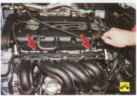 1. Снизьте давление в системе питания. Отсоедините провод от клеммы «минус» аккумуляторной батареи и снимите воздухоподводящий рукав.