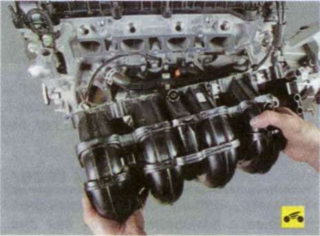 6. Выверните болты крепления впускного коллектора и снимите впускной коллектор в сборе с дроссельным узлом.