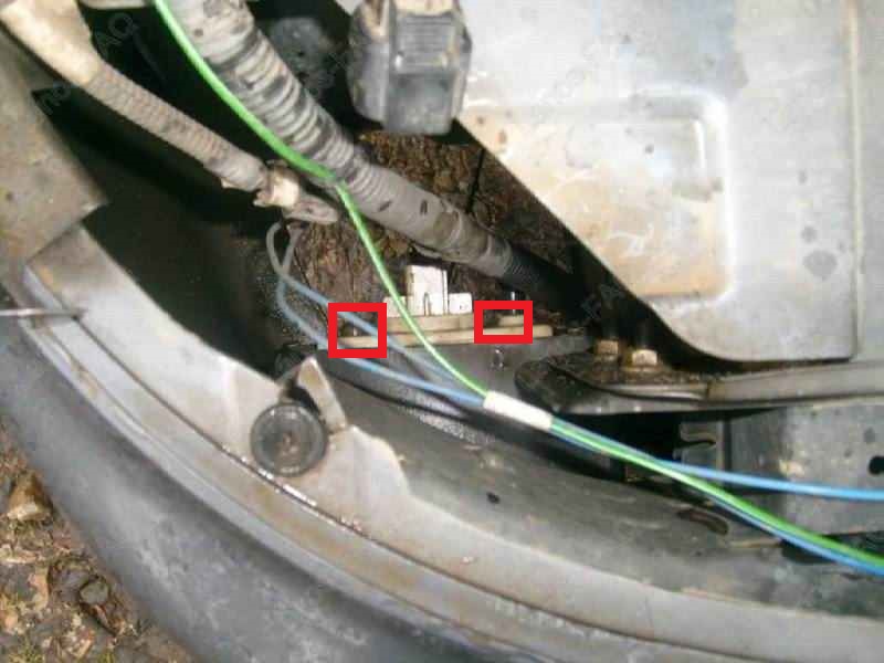 1. Противотуманные фары установлены в переднем бампере. Под передней частью автомобиля, нажав на фиксатор, отсоедините колодку проводов от противотуманной фары.